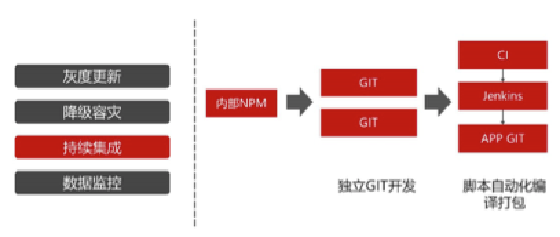 这主要是我们内部的一个开发模型,把所有 RN 的基础库,包括自己提供的一些公共组件库、公共 UI 组件库都部署在内部的 NPM Server 上。每一个接入的业务开发者、每个业务都会有一个独立的 GIT。因为在我们内部,其实业务开发团队可能会很多,我们的团队是负责维护框架,而业务开发团队各个部门各个地区都会有,他们会有申请自己独立的 GIT,然后从 NPM Server 上下载最新的 SDK 包进行业务开发。业务开发完成调试之后,会通过 CI 打包平台发起打包命令,然后触发 Jenkins 当中的 job,从对应的业务的规则拉取代码,进行编译打包。编译打包成功之后,把它部署到对应的 Android 或者 iOS 客户端版本当中进行整个发布。这种方式对业务开发者来说,最大的好处就是打包编译完全是脚本自动化,不需要获取客户端的源码就可以做到这个业务的开发和上线。