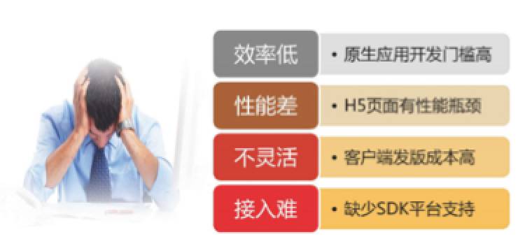 最后,接入困难。 因为 Android 和 iOS 平台有差异,所以任何一种垂直业务接入 APP 的成本非常高,很多业务代码和业务流程并不能复用,造成业务团队的开发、接入成本非常高。