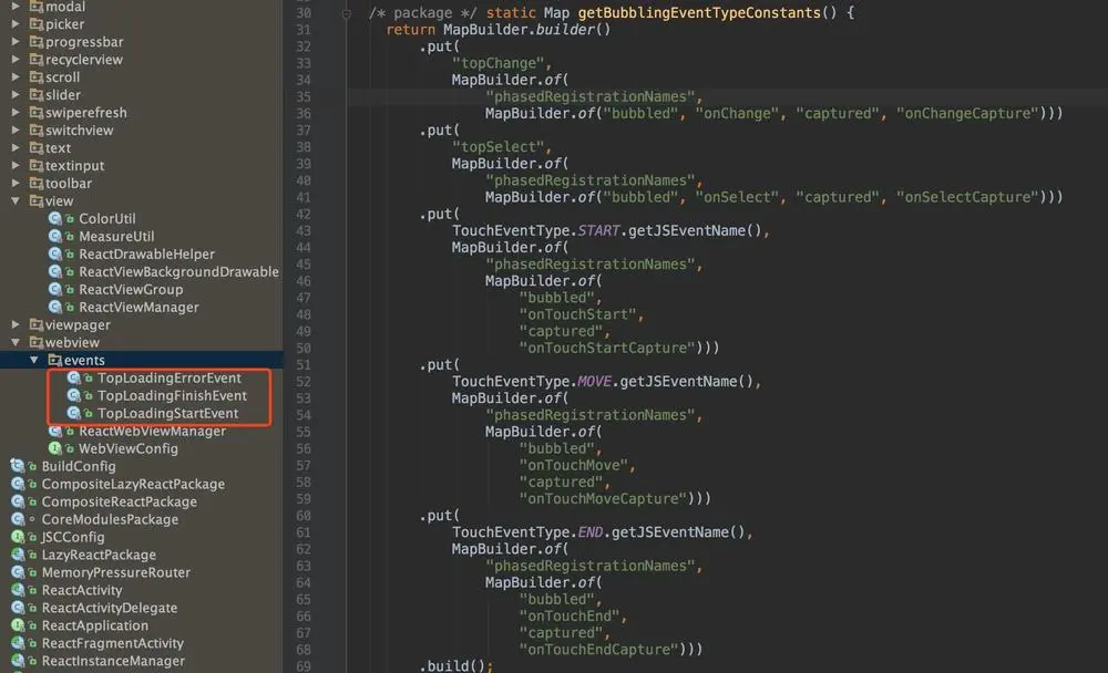 首先,在 UIManagerModuleConstants.java 中,如图4,react native默认映射了一些组件的消息事件名,如topChange在js组件中通过onChange监听,这样在原始中通过topChange发送的消息,就可以在组件中的onChange接收到消息。