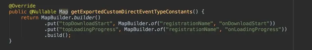 有时候,你可能还需要自定义自己的消息名,那么你需要重写getExportedCustomDirectEventTypeConstants ,只有注册了你的映射消息关系,才可以在js组件中,正常接收到你自定的消息名的消息。