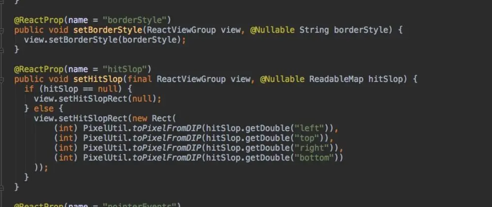 这里需要注意,@ReactPropGroup是一组相近的属性设置注解,如设置UI的上下左右的不同宽度,原生中通过index判断,而它们在js端组件的设置,可以统一到原生中的一个接口。