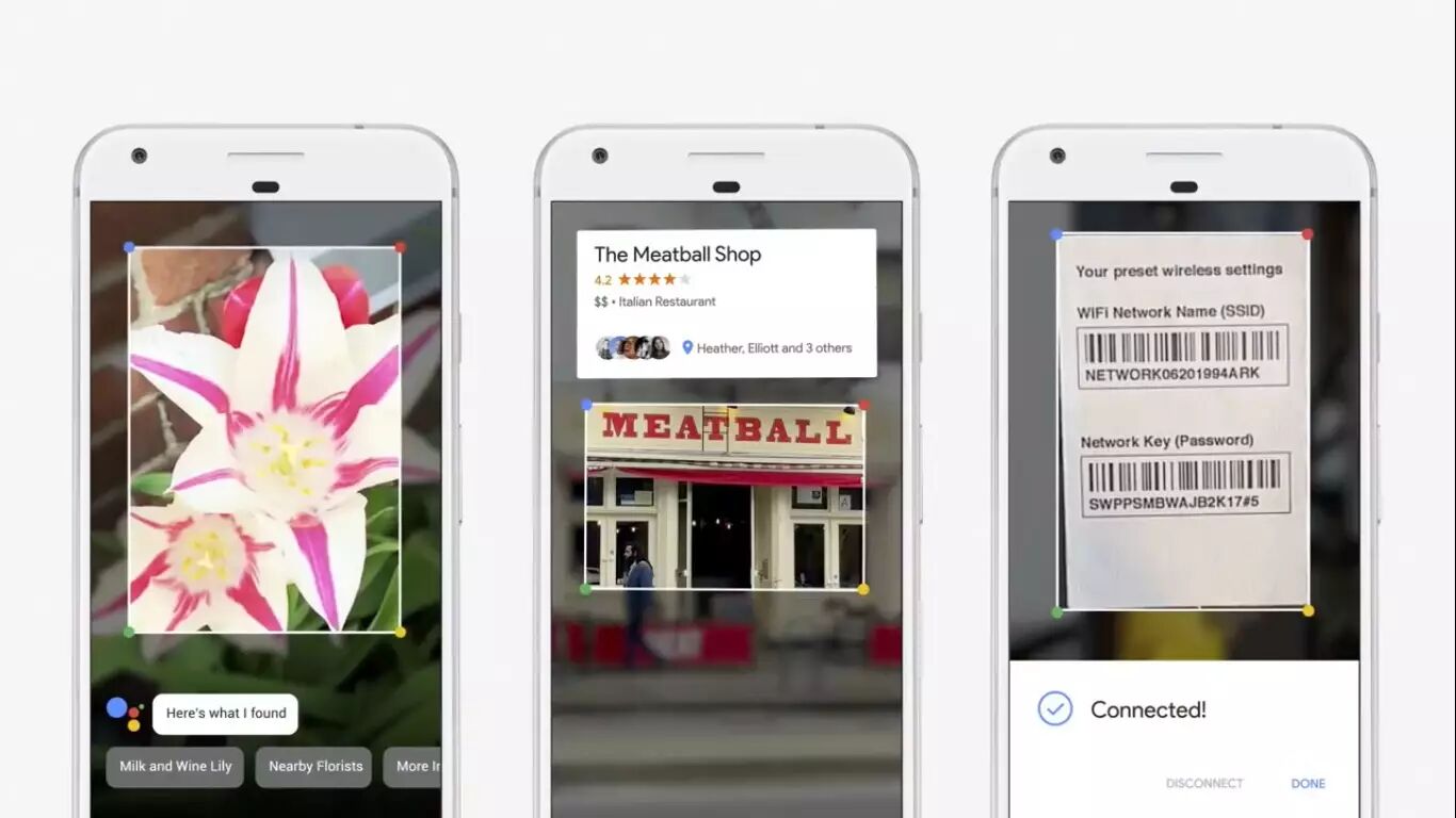Google Lens 是推出的一款全新产品,能帮你识别你看到的东西。比如你遇到某样东西, 你想知道它是什么,用手机对准它,Google Lens 就会告诉你这是什么;连接 Wifi 路由器时,用手机对准预设的信息,就能直接登录连上 Wifi,免去了复杂的输入;看到路边的一家餐厅,手机对准它,就能马上看到餐厅详细信息。