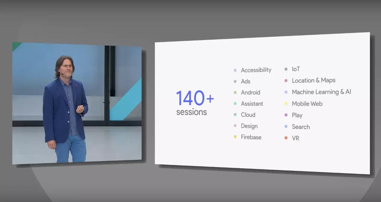 而 Keynote 结束后,接下来是 140+ 场的 BreakOut Sessions,涉及 Machine Learning & AI、Android、VR/AR、Mobile Web、IoT 等14个主题,内容绝对丰富。可惜,无法一一兼顾。