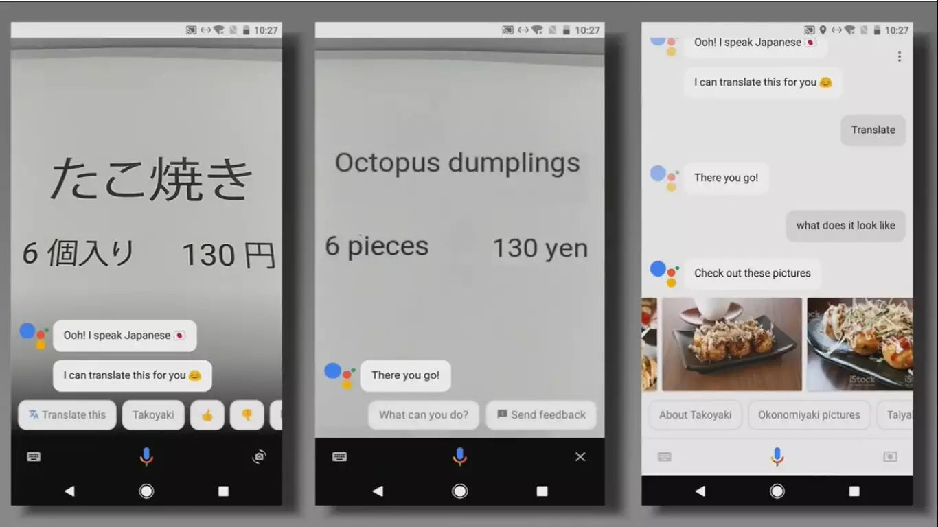 用 Google Assistant 对准不认识的菜单,文字立马被实时翻译;接着问这道菜长什么样,Google Assistant 很快给出了相应的实物图。Google Assistant 根据视觉语境,与人通过文字、语音顺畅地完成了整个会话,毫无违和感。