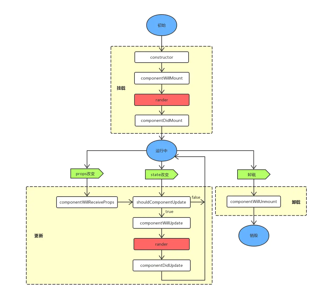 从上图所示,组件的生命周期分为三个阶段,分别是挂载(mounting)、更新(updating)和卸载(Unmounting),其中挂载和更新阶段都会调用rander方法进行绘制。下面对这三个阶段分别进行讲解。