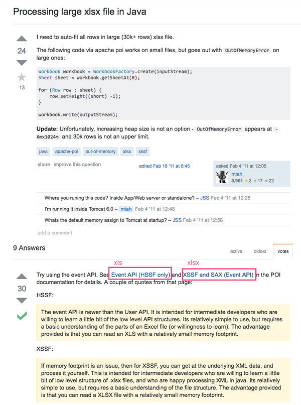 在Google中寻找java read big excel file oom,非常快的找到了一些靠谱的答案,都指向了需要用到POI的新API。请不要使用百度(不解释)。