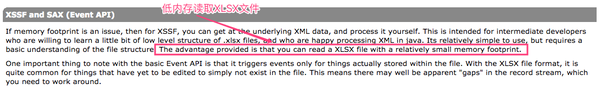 我使用了当前(2017-06)POI最新的3.16版本中的XSSF and SAX (Event API),暂不确定这个Event API是否是把Excel逐行放进内存处理的,但已经保证了在低内存(-Xmx256M)的情况下不会发生OOM错误。