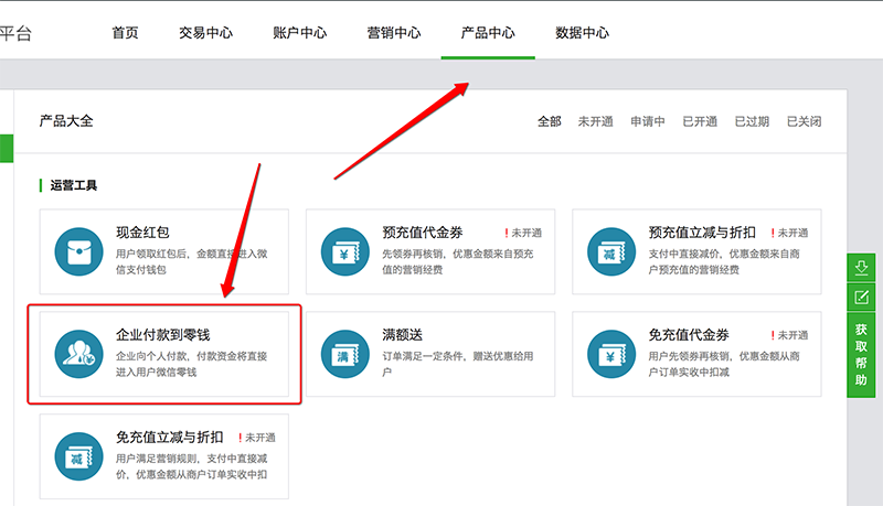 首先你必须开通微信支付且拥有“企业付款到零钱”的权限,进入微信支付 ➭ 产品中心,看看有没有企业付款到零钱,有就开通它,没有那就歇菜了~
