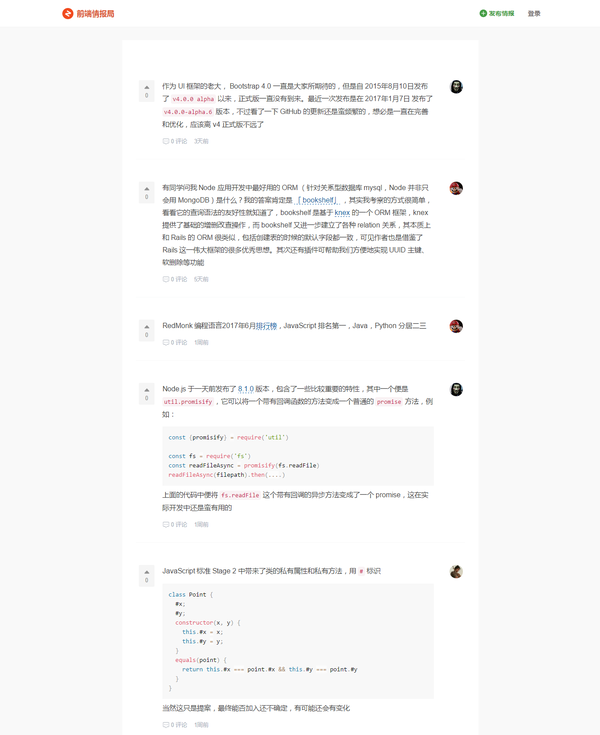作为一个围绕前端框架的社区,我们迫切需要一个地方能够获取最新的前端新闻,框架重大更新等等,「前端情报」便应运而生了,你可以在这里了解到:哪个框架又停止维护了,又出了什么牛逼的框架等前端最新的咨询,最终目地其实和我们的「前端TOP100」类似,让你跟上前端发展的步伐,扩充你的前端视野。