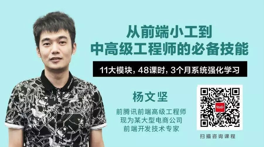 视野拓展StuQ 联合杨文坚老师推出前端小工提升课,13 周 48 课时,十一大主题模块,让您快速提升,冲刺的中高级程师。