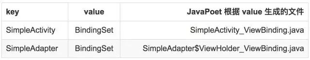 这里重点关注下 bindingMap 的键值对。key 值为 TypeElement 对象 ,可以简单的理解为被解析的类本身,而 value 值为 BindingSet 对象,该对象存放了解析结果,根据该结果,JavaPoet 将生成不同的 Java 文件,以官方 sample 为例,其映射关系如下: