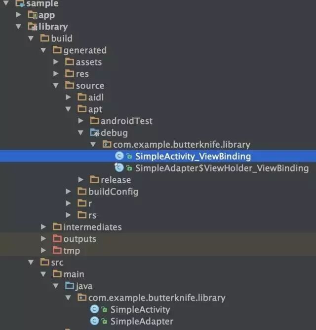 2.butterknife-compiler:见名知意,编译期间将使用该工程,他的作用是解析注解,并且生成 Activity 中 View 绑定的 Java 文件。