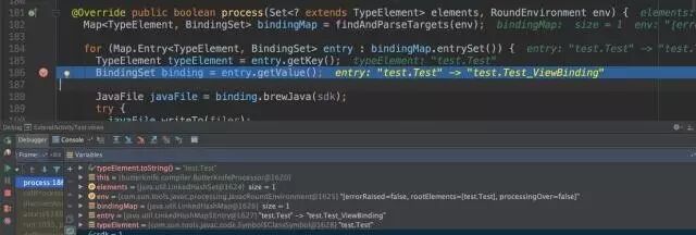 butterknife 子组件中配备了大量的单元测试,这些单元测试是为 ButterKnifeProcessor量身打造的。比如 ExtendActivityTest 中的 views() 对 Activity 包含@BindView 的注解时的处理做了单元测试,运行 UT 后,可以随意断点,如下图: