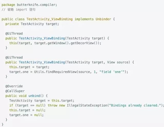 有了浪漫的 Java 诗人之后,可以做很多充满想象力的事情。以 ButterKnife 而言,他做的事情便是将注解处理器解析后的结果(实际上就是上文提到的 BindingSet 对象)生成 Activity_ViewBinding.java,该对象负责绑定 Activity 中的 View 控件以及设置监听器等。