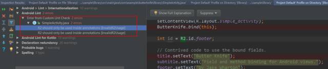 从工程名来看,不难理解这工程的意义:一个静态代码检查工具,用来验证非法的 R2 引用。一旦在我们的业务项目里不小心引用了 R2 文件,当执行 Lint 后,将会有如下图的提示信息: