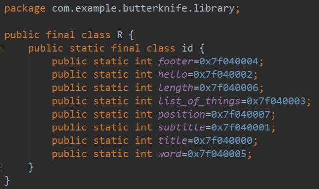 也就是说 BindView 注解的属性必须是常量。但是在 library 工程中 R.id.title 的值为变量,如下图(注:并没有 final 修饰符):