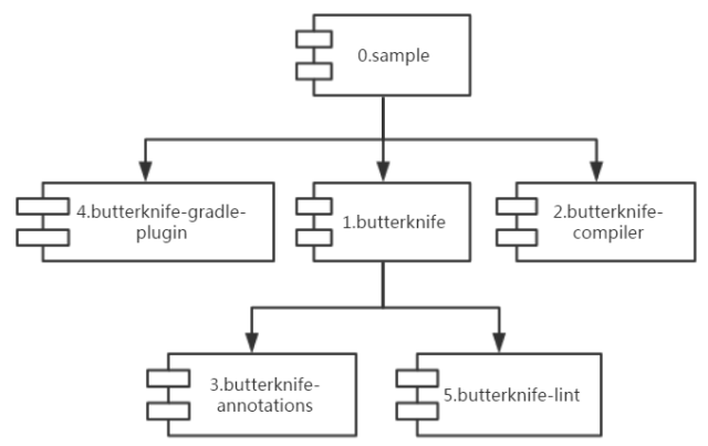 0.sample:代表使用 ButterKnife 的业务项目,根据上图所示需要依赖与3个组件,因此我们在使用 ButterKnife 时需要做如下配置: