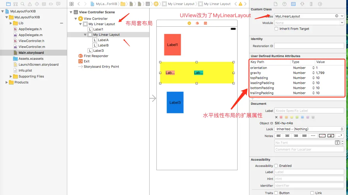 上面的例子我们进行了简单的布局扩展属性设置,那么如果我们要实现布局套布局怎么办呢? 既然我们可以把根视图转化为一个布局视图类,那么我相信您可以举一反三了。我们只要直接在根布局视图中,先添加一个UIView视图,然后把类名改为对应想要使用的布局视图就可以了。我们将上面例子中的中间UILabel改为一个水平线性布局(需要注意的是在放置时需要将三个子视图的frame的高度设置为一致,这个gravity属性拉伸才能得到相同的高度。)。而水平线性布局则有2个子视图:
