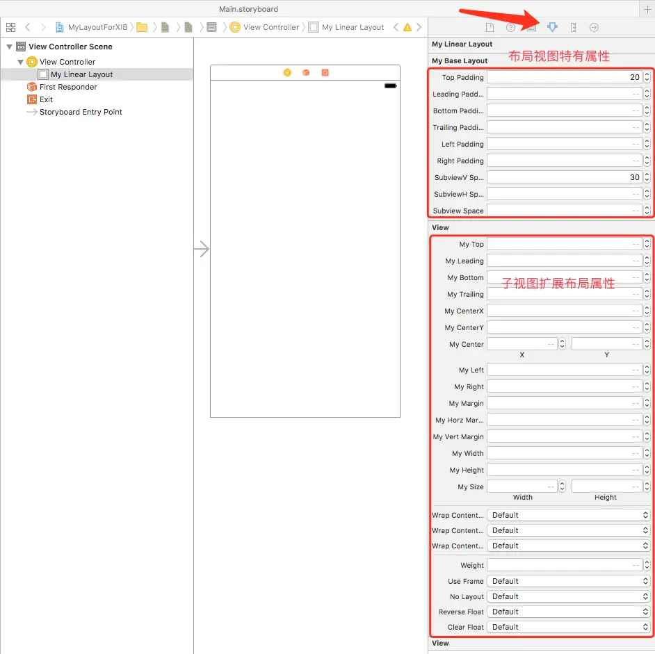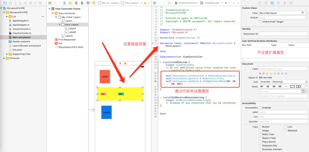 这样是不是非常的简单。当然如果您不想在XCODE的界面编辑器中设置布局视图的各种属性,而是想通过界面编辑器来建立视图,然后通过代码设置属性或者要设置界面编辑器无法设置的布局属性时。那么你需要将布局视图设置为一个IBoutlet插座变量,然后在对应的地方设置布局属性或者子视图扩展属性或者复杂的布局属性就可以了: