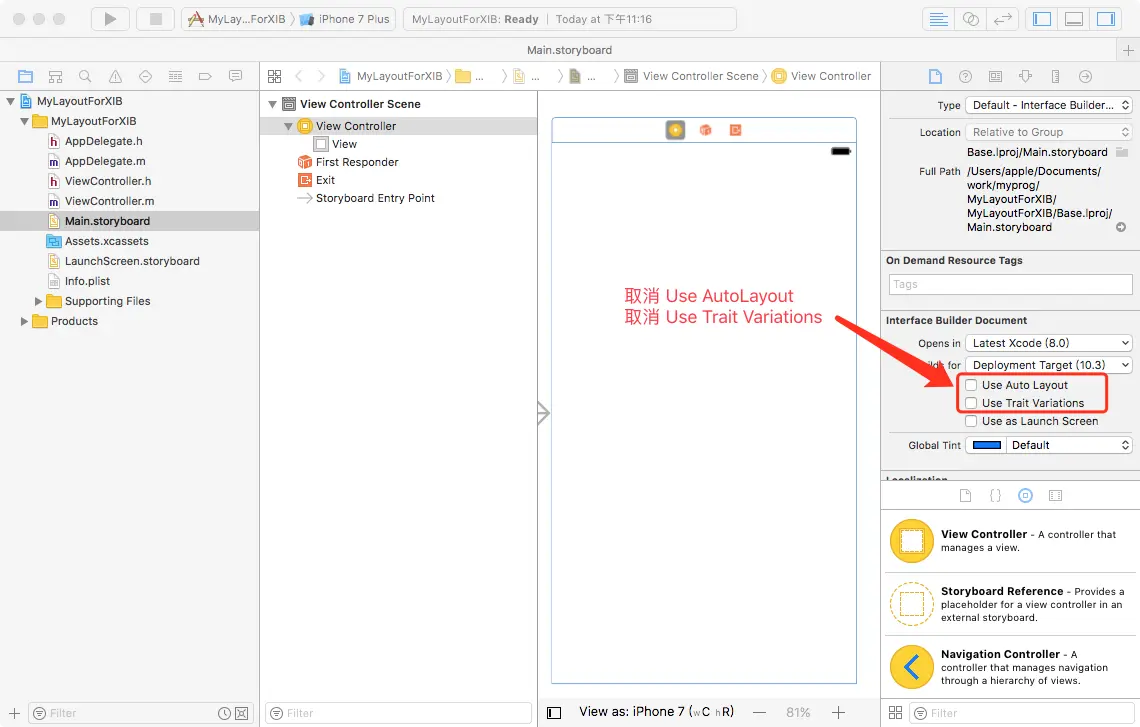 第一步就是要将XIB或者SB中对AutoLayout和Size Classes的支持去掉: