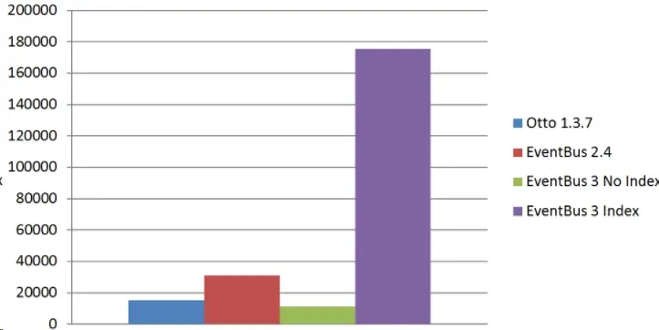 The above graph shows the resulting speed in registrations per second (higher is better). As we can see, the EventBus3 without Index is indeed slower than EventBus2. The reason is that analysis I did above.