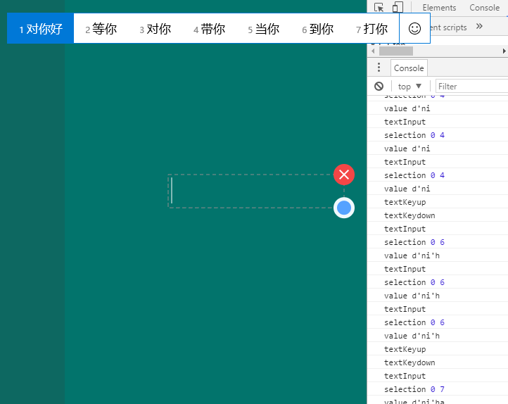 }上面的代码引入了isCompositionsting变量,结合selectionStart和selectionEnd来做文字处理。其他方法同理,这里就不过多讲解了。下面我们来分析点异常情况。