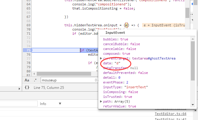 从上图中我们可以看到,触发的事件为InputEvent,从该事件对象的data属性中可以获取到当前输入的按键值。