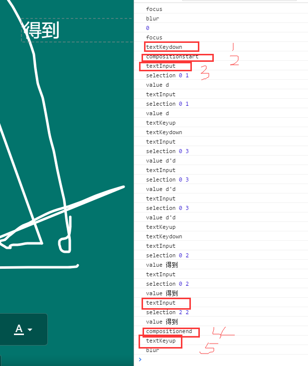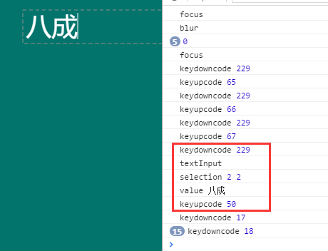 这是一对事件,当非直接输入开始第一个按键的时候,触发compositionstart事件,非直接输入结束的时候触发compositionend事件, 在直接输入情况下,这两个事件都不会触发。我们添加对这两个事件的监听: