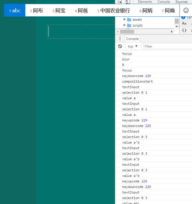 我们在代码中对keydown,keyup,input,compositionstart和compositionend同时做事件监听,然后使用这个版本的搜狗输入法做输入。结果如下: