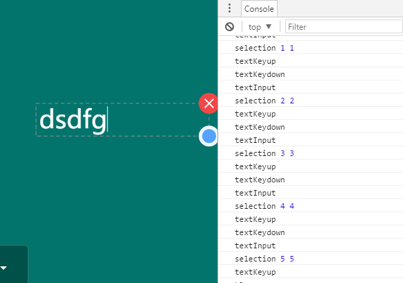 上图是我在oninput事件中打的日志,可以明显的看到每次oninput触发之后,selectionStart和selectionEnd的值都相同而且表示最后一个文本,视觉上是我们看到的光标所在的位置,如果我们挪动光标,这两个值也会变化。这里我们提取两个关键特征,在及时输入的情况下: