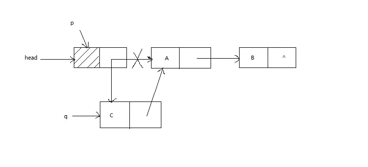 (b) 头插入,不改变head,不用区分插入位置,头结点后面插入元素C如下图所示: