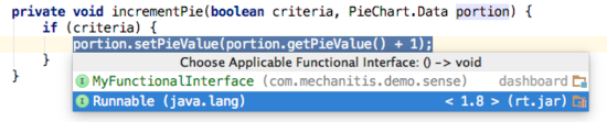 这里让你可以使用 Lambda 表达式而非对象来 创建一个参数 。这个功能的好处在于其建议使用一个已有的 函数接口 来匹配这个规范。