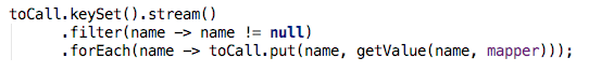 <img src="https://pic1.zhimg.com/v2-fb972284c1dca23aac4f588c163ea394_b.png" data-rawwidth="548" data-rawheight="164" class="origin_image zh-lightbox-thumb" width="548" data-original="https://pic1.zhimg.com/v2-fb972284c1dca23aac4f588c163ea394_r.png">把它们变成一个方法引用, 方法引用看起来有一点陌生,但却值得这样做,因为在某些情况有助于提高可读性,后面我再谈可读性。