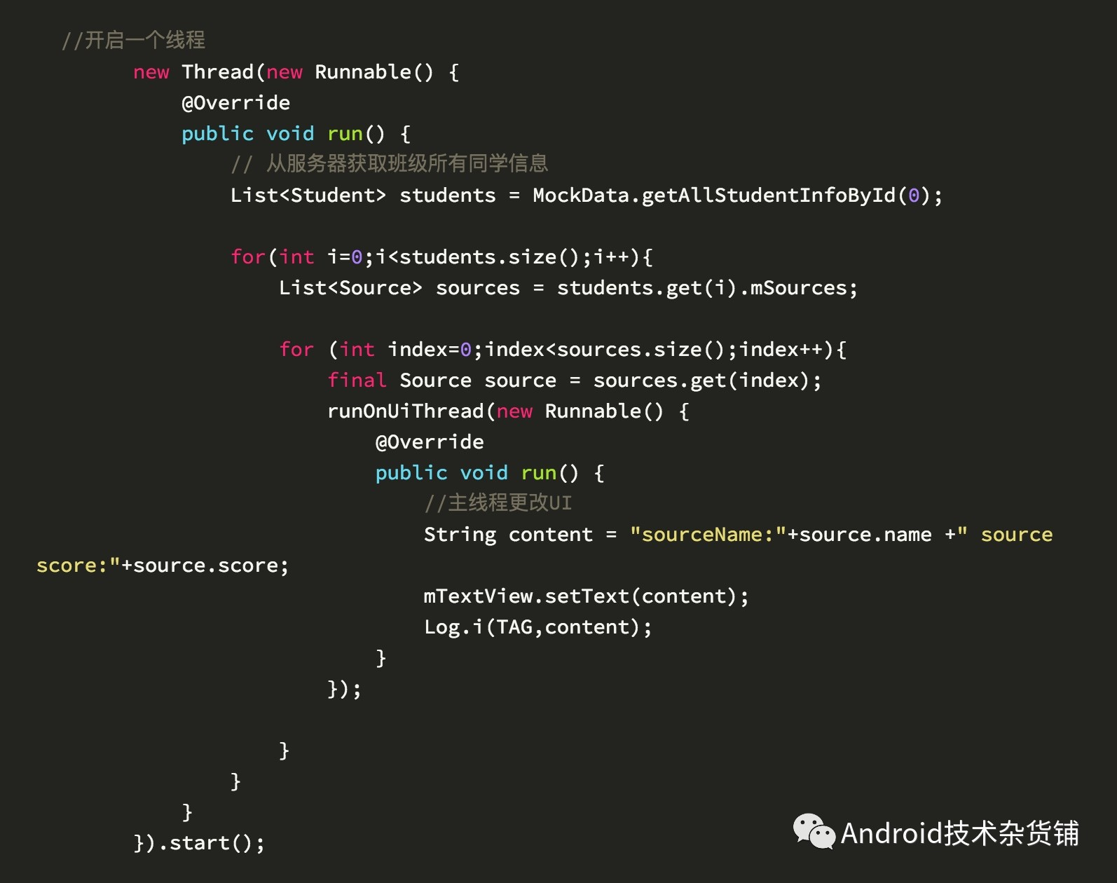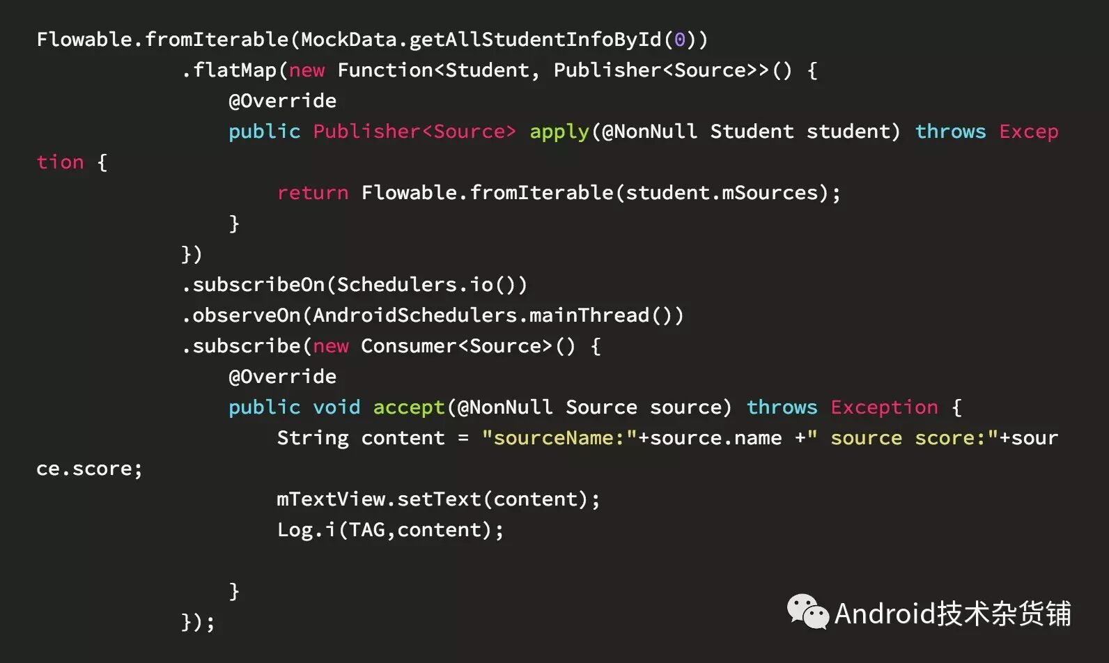 以上就是传统的实现方式,可以看到整个代码的结构是非常难看的,如果在加一些其他的过滤条件,要打印指定某一个人的某一门课程的成绩?那么我们又会嵌套if-else判断,这种多层的循环嵌套使得我们的代码可读性变得非常差。怎么解决呢?flatMap操作符就是专门为这个而生的,我们来看一下用flatMap来改造一下: