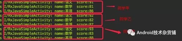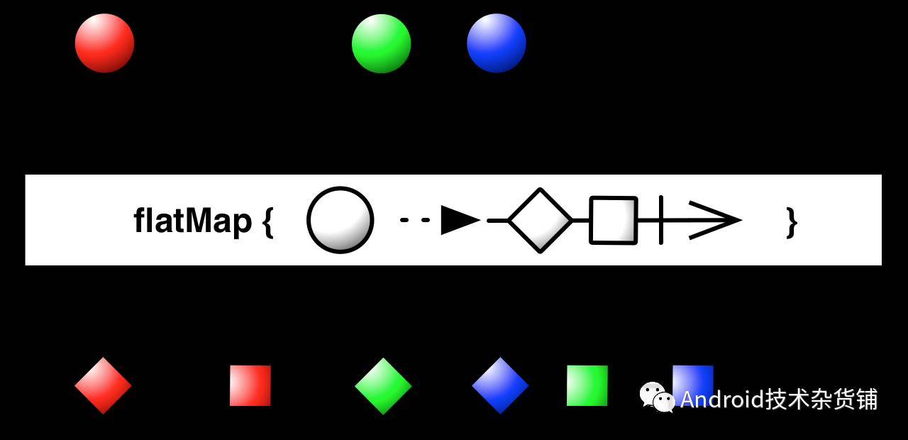 flatMap操作符执行的变换(将圆变换为一个菱形和正方形),函数返回的是一个可以发射数据(菱形和正方形)的Observable,最合后并这些发送数据的Observable。那么映射到上面的这个示例就是:List< Student > 代表圆,然后`Flowable.fromIterable(student.mSources)`就是flatMap执行的变换操作,返回的就是可以发射Student数据的Observable(本文用的是Flowable),最后合并后的结果就是自己的数据序列( 也就是上图中打印的3个同学的各门成绩)。