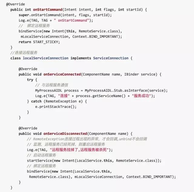 3.在LocalService中绑定RemoteService并监听对方的创建和销毁,RemoteService中的实现也一样。
