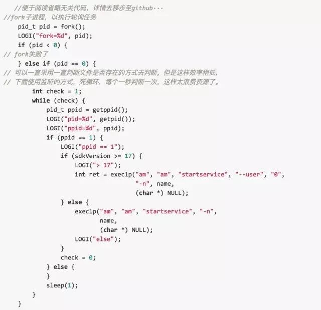 原理介绍:这种双进程守利用了Linux子进程在父进程被干掉后还能运行而实现。所以我们要做的是通过java去fork一段C的代码。通过动态链接库封装起来。然后在C代码里不断轮训父进程的ppid是否存活。如果挂掉了侧重新唤醒。