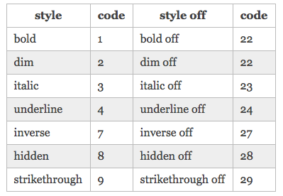如果了解 CSI codes 的规则就会发现,对于颜色数据 ESC[ + code1;code2;...;codeN + m 的写法其实和 ESC[ + code1 + m + ESC[ + code2 + m + ... + ESC[ + codeN + m 的效果是一样的,目前 Node.js 中大部分 Color 模块都是按照后者的情况来实现的。