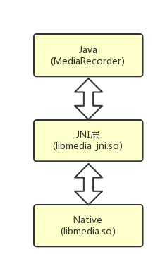 Java世界对应的是MediaRecorder.java,也就是我们应用开发中直接调用的类。JNI层对用的是libmedia_jni.so,它是一个JNI的动态库。Native层对应的是libmedia.so,这个动态库完成了实际的调用的功能。