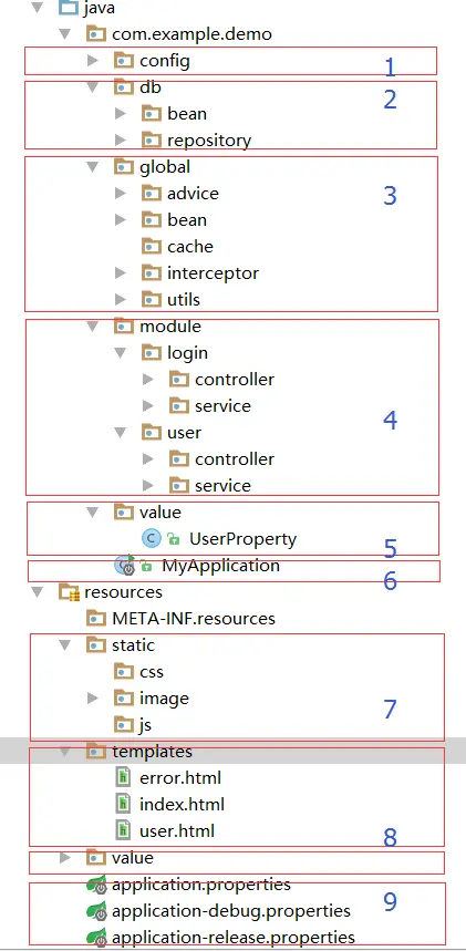 - 6是程序的入口,因为Spring Boot的配置信息会自动扫描和该文件同级的目录及其子目录的信息,故放在根目录下。