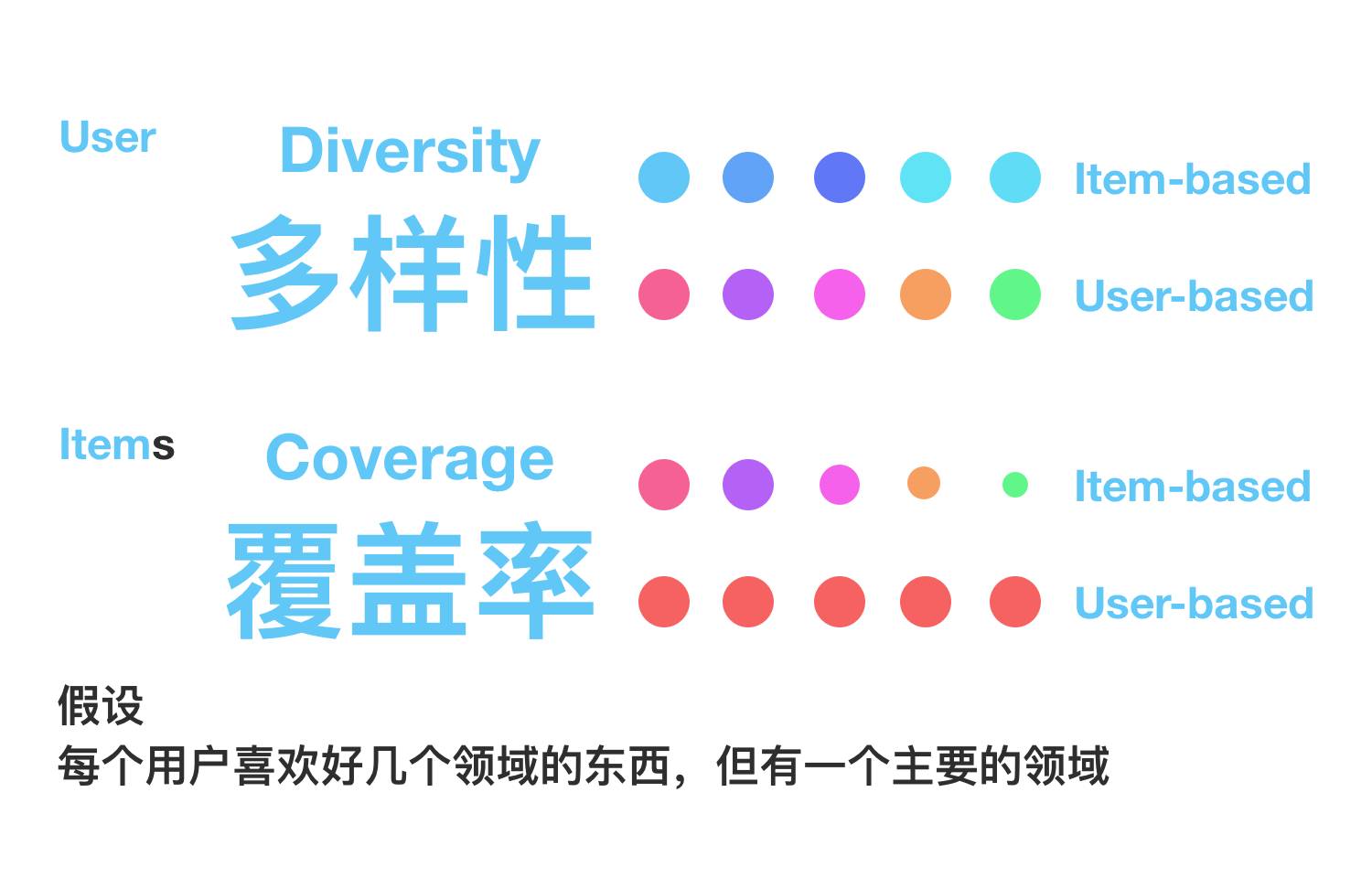 而 Item CF 只推荐 A 领域给用户,这样他有限的推荐列表中就可能包含了一定数量的不热门的长尾物品,同时 Item CF 的推荐对这个用户而言,显然多样性不足。但是对整个系统而言,因为不同的用户的主要兴趣点不同,所以系统的覆盖率会比较好。