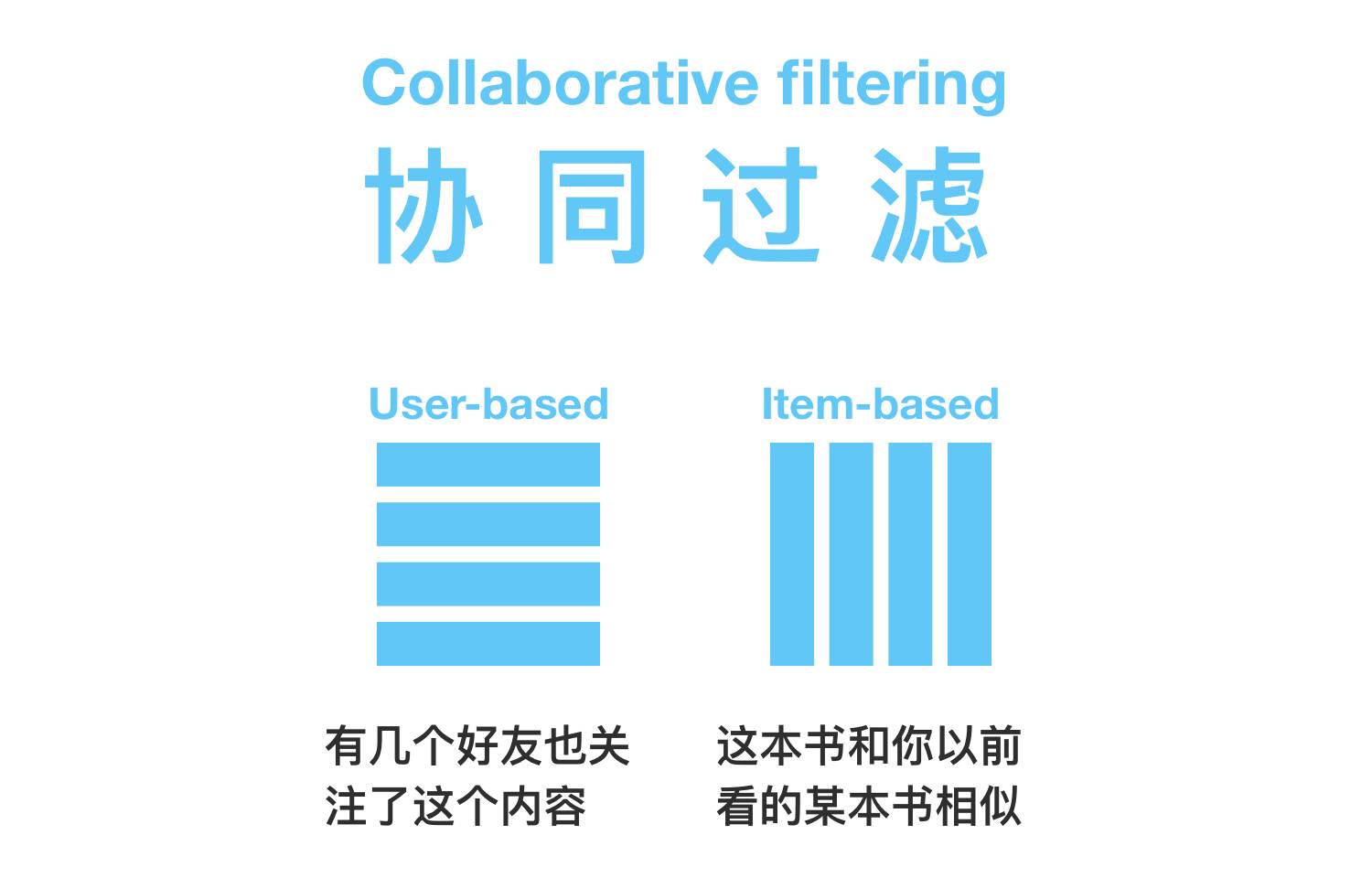 为A用户找到他真正感兴趣的内容的好方法是,根据以往的A、B、C、D...用户产生的数据分析,找到与A用户有相似兴趣的其他用户B、D...,然后将B、D...感兴趣的内容推荐给A用户。