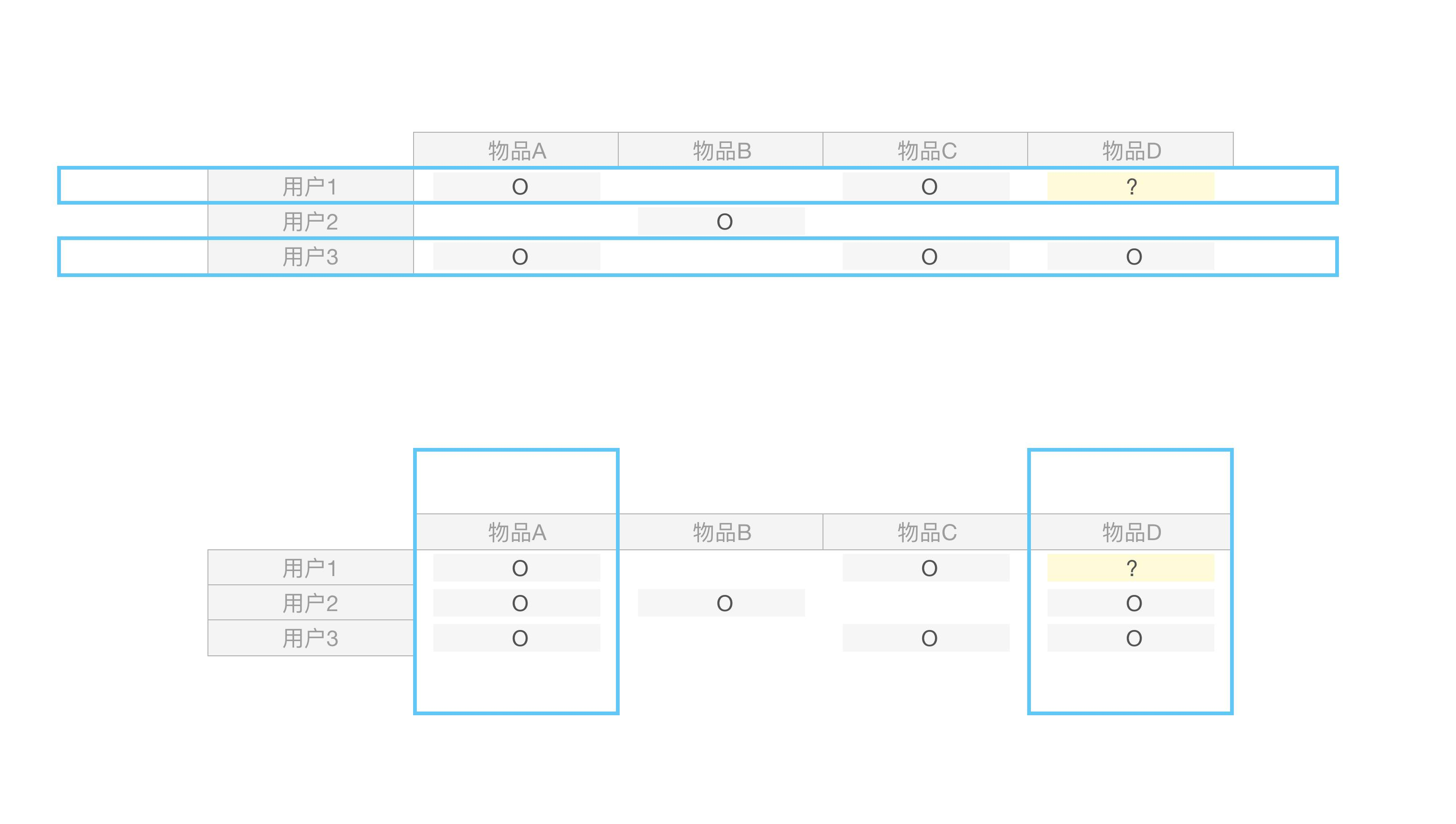 表2: 物品A与物品D受欢迎程度类似,所以物品D与A是某一类用户会同时喜欢的物品,物品D可以推荐给用户1。