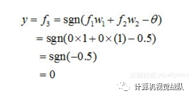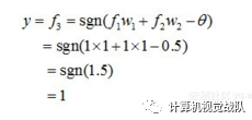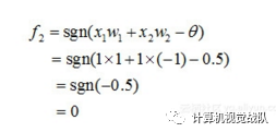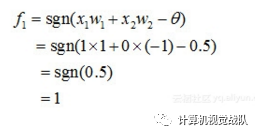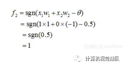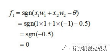 接下来详述整个实现过程。假设激活函数为阶跃函数(sgn函数),则:当x >0时,f(x) 输出为1,反之输出0。对于x 1和x 2均为1时(x 1和 x2相同),则隐层的神经元1为: