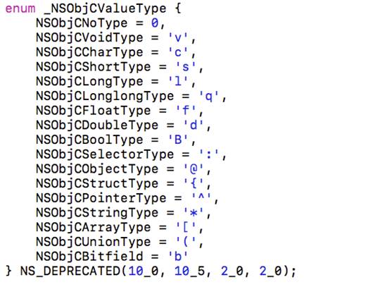 另外方法在执行时我们选择了NSInvocation,因为可以从里面获取到方法执行时所需参数的数据类型以及方法返回值的数据类型。在NSInvocation.h文件源码里面我们知道有些数据类型我们是可以获得的: