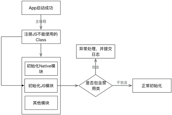 对于一些特殊的类,或者存有敏感信息的类,在系统启动完成后可以通过硬编码的形式注册到系统中去参见上图,JS核心层在请求这些类信息时会去敏感类注册池内进行比对,如果改类已被注册则会抛出异常。