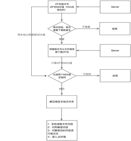 文件来源控制我们采用了业界常用的方法(参见上图),通过对文件非对称加密及md5值比对来保证文件来源,这里就不多说了。