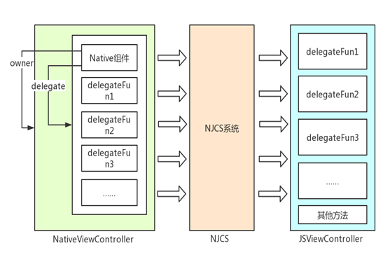 为了方便管理和使用所有的原生UI组件都是经过封装(以组合的方式封装进了NJCSUIView中)的,组件的代理在封装的时候一并实现了,同时给当前组件添加了一个owner属性指向当前组件归属的UIViewController(如上图所示),如此,组件的代理方法在被调用的时候,会根据owner找到在js环境中与之对应的JSViewController并运行它的方法。