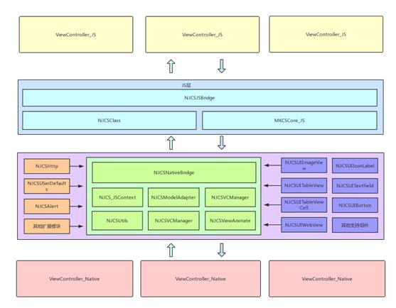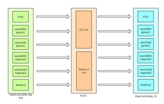 我们在Native环境中创建UIViewController实例viewController_native的同时在JS环境内也创建了一个与之对应的NJCSUIViewController实例viewController_js,系统在调用实例viewController_native生命周期方法(如:init()、viewDidLoad()、viewWillAppear()、viewDidAppear()等)时,改方法内部就会去调用实例viewController_js中相对应的方法。如此,本来需要在Native中完成的逻辑我们移到了JS中,所有逻辑在viewController_js中实现即可。