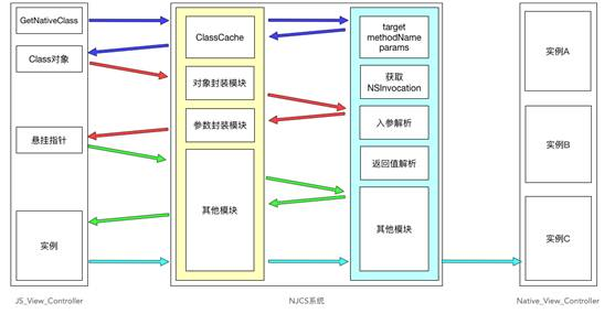红色的是alloc获得该类悬挂指针的数据信息流:业务层将原生类对象,想要执行的方法名称以及方法执行时需要的参数提交到JS核心层,JS核心层解析并封装相关的数据信息,然后将封装后的数据信息提交到Native核心层,Native核心层解封数据信息,并根据这些信息执行相应的方法,将执行结果返回。